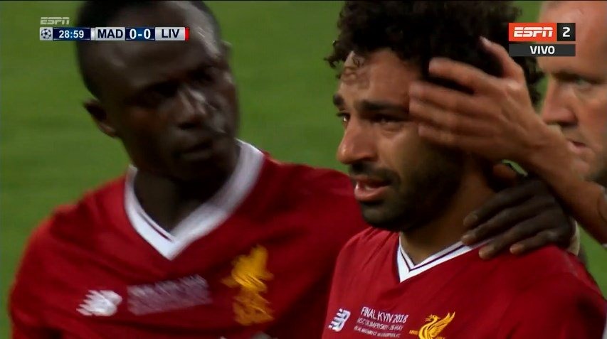 Esto ocurrió en el minuto 25 de la primera parte, cuando ambos equipos empatan 0-0. Mohamed Salah chocó con Sergio Ramos y cayó violentamente sobre el terreno de juego de hombro.