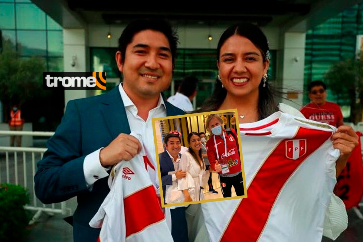 Los novios consiguieron su objetivo ya que el director técnico de la selección peruana se acercó para tomarse una fotografía, y de paso, para nuevamente atraer la buena fortuna.