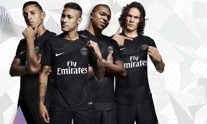 La llegada de Neymar disparó la venta de camisetas del PSG en toda Europa y ahora quieres repotenciar la venta de más casaquillas con la llegada de la joya del fútbol francés Kylian Mbappé. En esta ocasión el club presenta una versión donde predomina el color negro, con un efecto de camuflaje geométrico que le aporta un aire novedoso y moderno gracias a su tecnologíoa 'Aeroswift'.