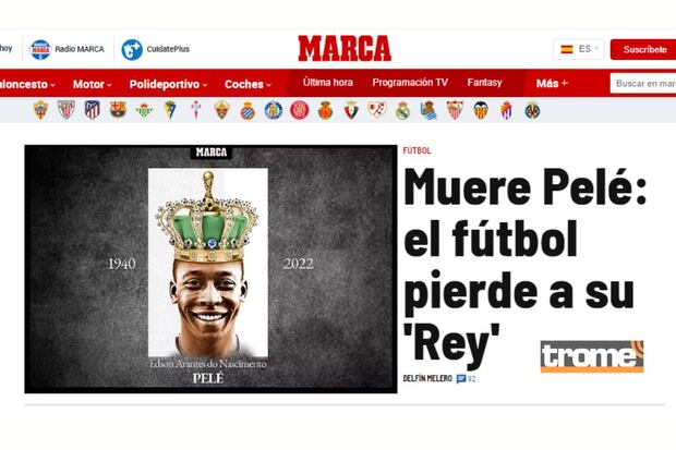 Los medios españoles como Marca, AS y Mundo Deportivo también se ocuparon de la pérdida irreparable para la historia del fútbol y del jugador más talentoso a través de los tiempos. El diario madrileño puso en su portada una foto de Pelé con una corona de joyas para resaltar aquella imagen con la que partió a la eternidad.