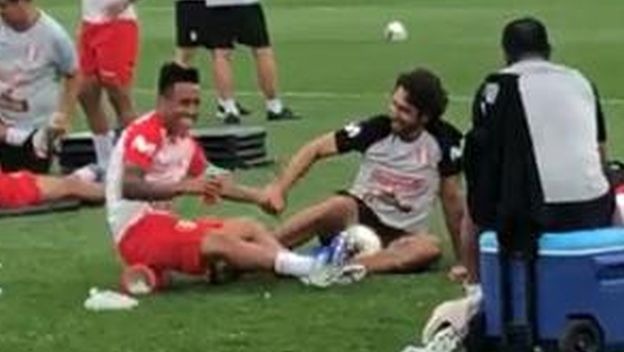 En la práctica sabatina, ‘Aladino’ y el coach ontológico de la ‘Blanquirroja’ se juntaron para jugar a que no caiga la pelota. Durante varios segundos, los dos deportistas mantuvieron el balón en el aire, dando toques con la parte externa del pie.