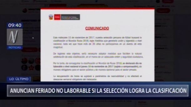 "De lograr el sueño de la clasificación al Mundial Rusia 2018 este miércoles 15 de noviembre, se declarará día no laborable a nivel nacional el jueves 16 de noviembre (sujeto a compensación)", se lee en el comunicado de la institución.