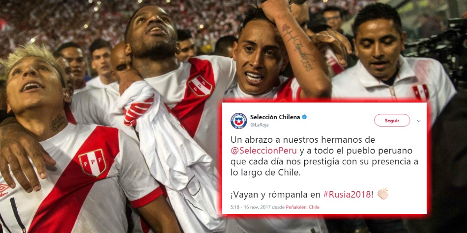 A través de Twitter, la selección chilena compartió las siguientes palabras: "Un abrazo a nuestros hermanos de @SeleccionPeru y a todo el pueblo peruano que cada día nos prestigia con su presencia a lo largo de Chile. ¡Vayan y rómpanla en #Rusia2018!".