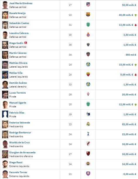 Entre sus deportistas con mejor tasación se encuentran José María Giménez (Atlético Madrid) con 50 millones, le siguen Ronald Araújo (Barcelona) que cotiza 40 millones de euros, Darwin Núñez (Benfica) con 40 millones de euros, Lucas Torreira (Fiorentina) registra 20 millones de euros y Rodrigo Bentancur (Tottenham) en 25 millones de euros.