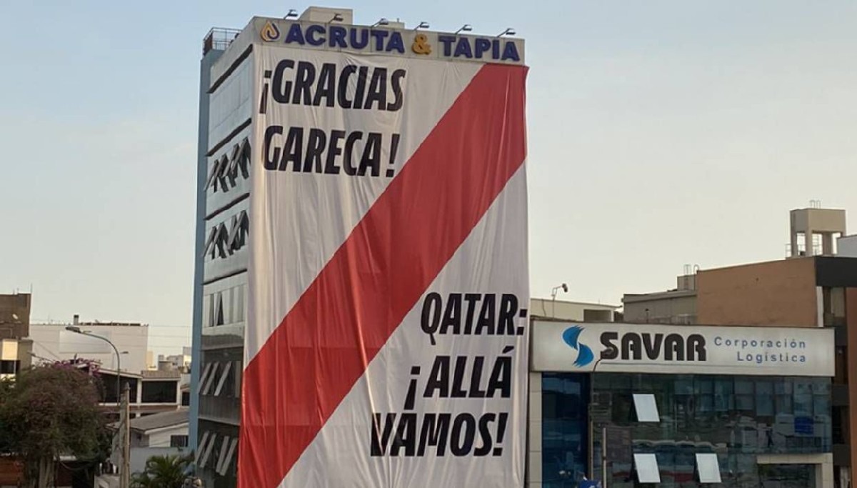 “¡Gracias, Gareca! Qatar: ¡Allá vamos!”, es el mensaje que se lee en todo el afiche, con las letras sobre un fondo blanca y una franja roja cruzando los 8 pisos del inmueble.