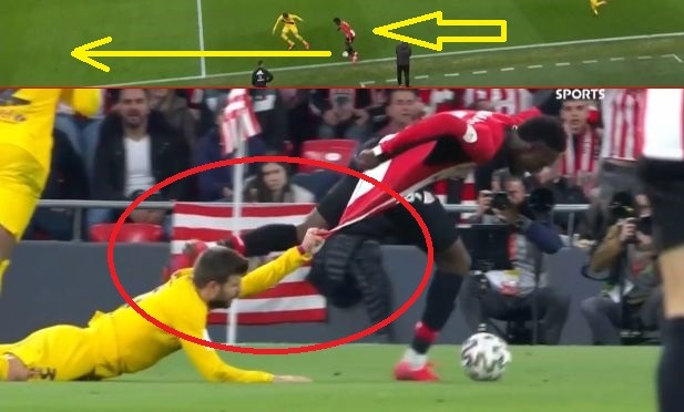 Piqué fue a marcar al atacante Iñaki Williams, que todavía estaba en campo propio y pegado a la banda, y tras ser superado en velocidad solo atinó a detenerlo con una falta.