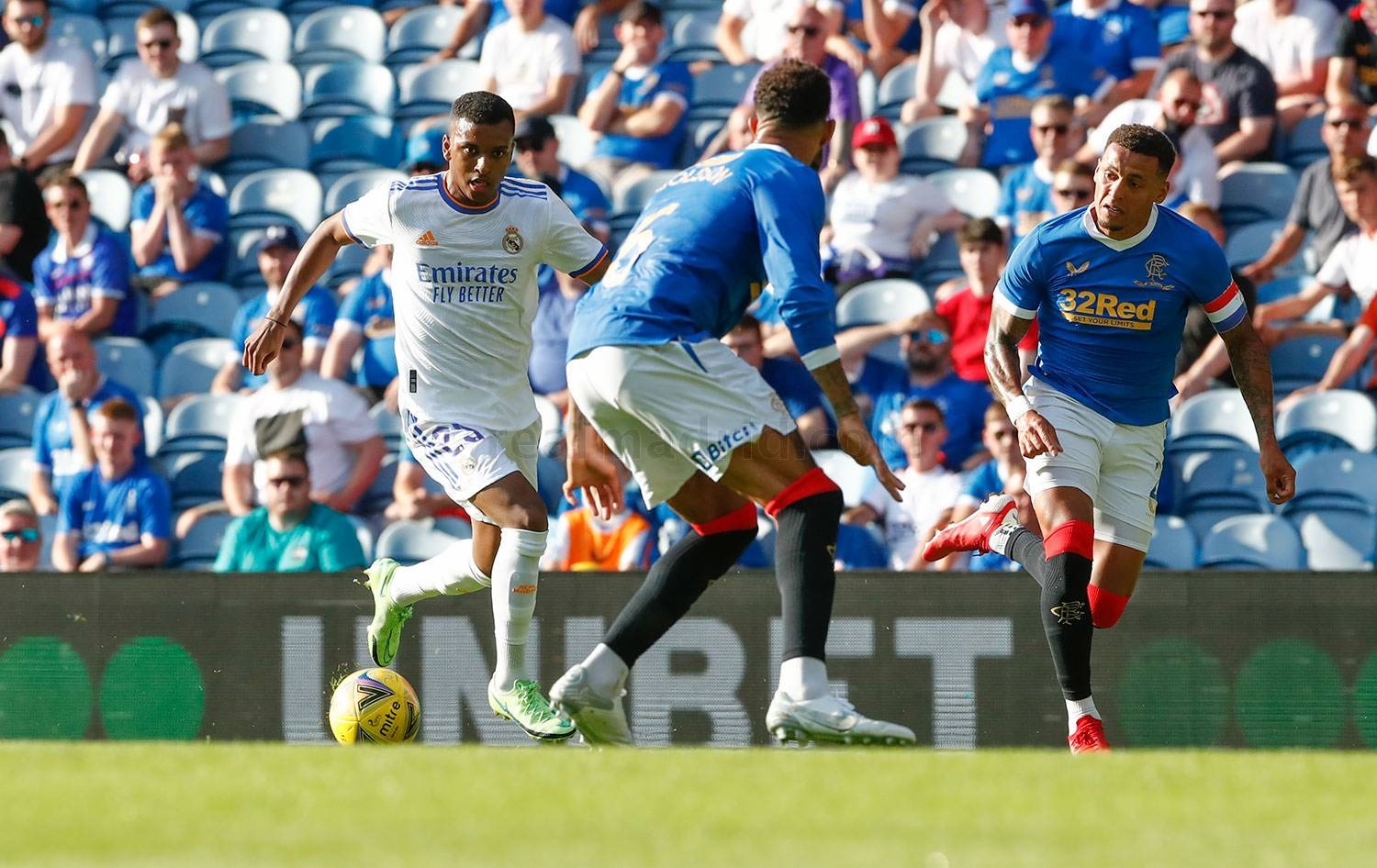 En un primer tiempo hubo 18 disparos del Rangers por uno del Real Madrid, pero ese justamente fue el del gol. Este se dio a los 8′ en un contragolpe que inició el noruego Martin Odegaard hasta llegar a la definición perfecta, del brasileño Rodrygo Goes.