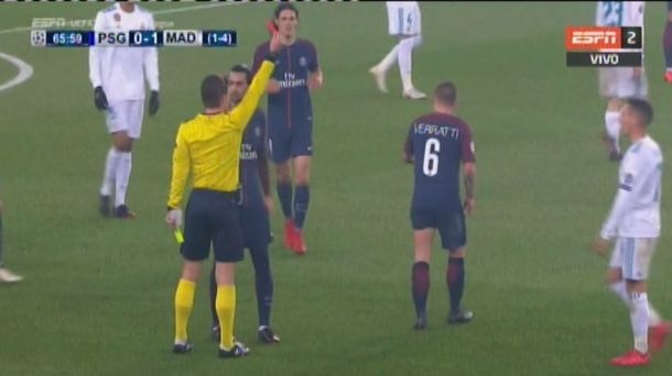 El árbitro no dudó en sacar a Verratti la segunda tarjeta amarilla- la primera fue por una falta a Casemiro- en el Real Madrid vs PSG, saliendo expulsado.