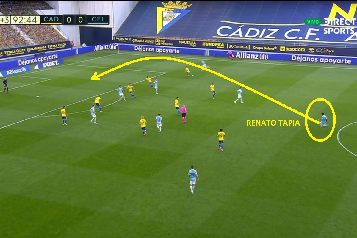 Ocurrió en la última jugada del encuentro. Renato Tapia recibió la pelota sin marca, se dio el tiempo para pensar en el pase y aplicó un sutil toque para la cabeza de Hugo Mallo, capitán de Celta de Vigo, que llegó hasta el corazón del área de Cádiz.