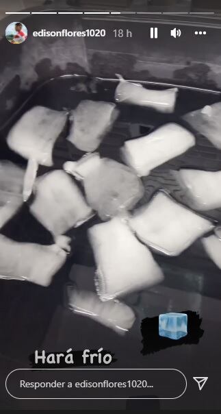 “Hará frío”, escribió Flores sobre la imagen de un recipiente grande con bloques de hielo, que son necesarios usar para aliviar algún dolor o desinflamar los músculos.