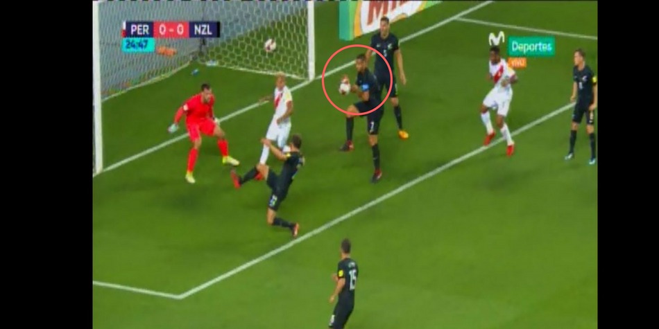 Perú vs. Nueva Zelanda. A los 24 minutos del partido más emocionante al que se ha enfrentado la selección peruana después de 36 años, se vio una mano de la selección neozelandesa que causó cierto grado de euforia porque no fue cobrado.
