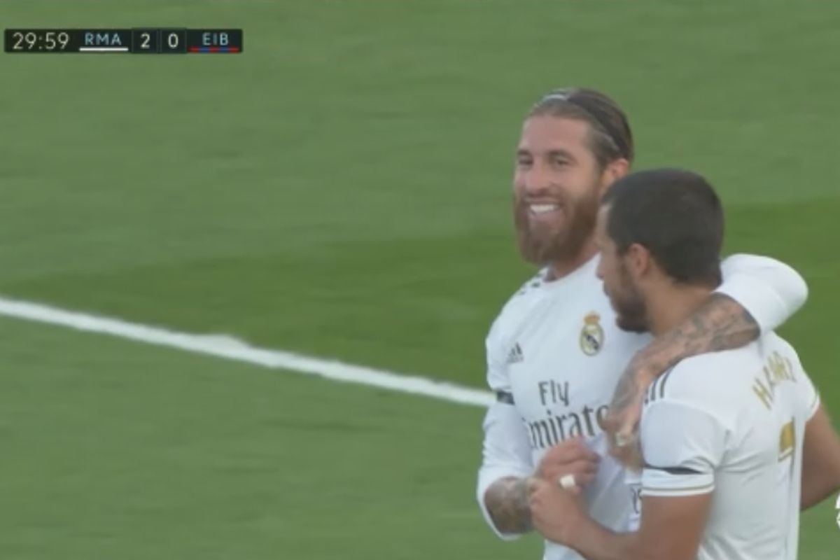 Ya en el área de Eibar, Sergio Ramos recibió un gran pase de Eden Hazard y solo tuvo que empujar el tanto ‘blanco’ por el campeonato español.