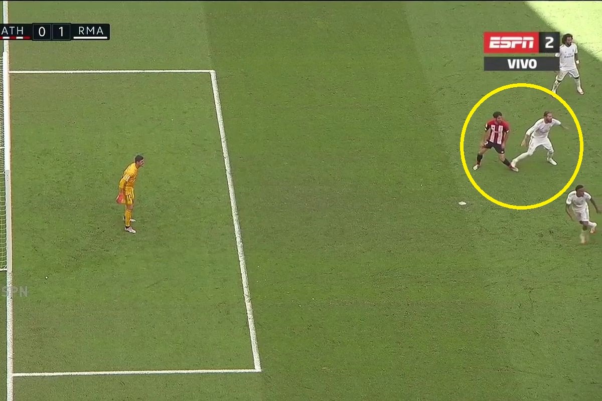 Pasó a los 75′ del segundo tiempo. Sergio Ramos le aplicó un pisotón a Raúl García mientras la pelota estaba en otro sector del campo. Falta fue similar al de Marcelo, que significó penal y gol para Real Madrid.