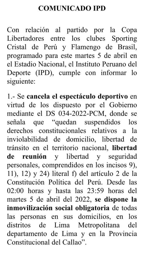 “Se cancela el espectáculo deportivo en virtud de lo dispuesto por el Gobierno mediante el DS 034-2022-PCM, donde se señala que “quedan suspendidos los derechos constitucionales relativos a la inviolabilidad de domicilio, libertad de tránsito en el territorio nacional, libertad de reunión y libertad y seguridad personales (…)”, comunicaron.