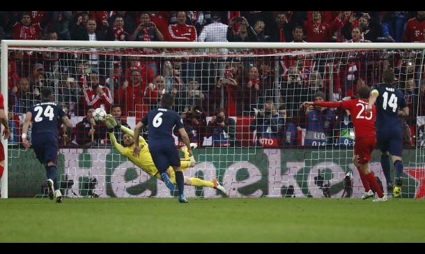 El arquero Jan Oblak, a los 34 minutos, adivinó la dirección del disparo de Thomas Müller y evitó un resultado difícil de revertir 2-0. Minutos antes Xabi Alonso había convertido el primer gol del cuadro bávaro.
