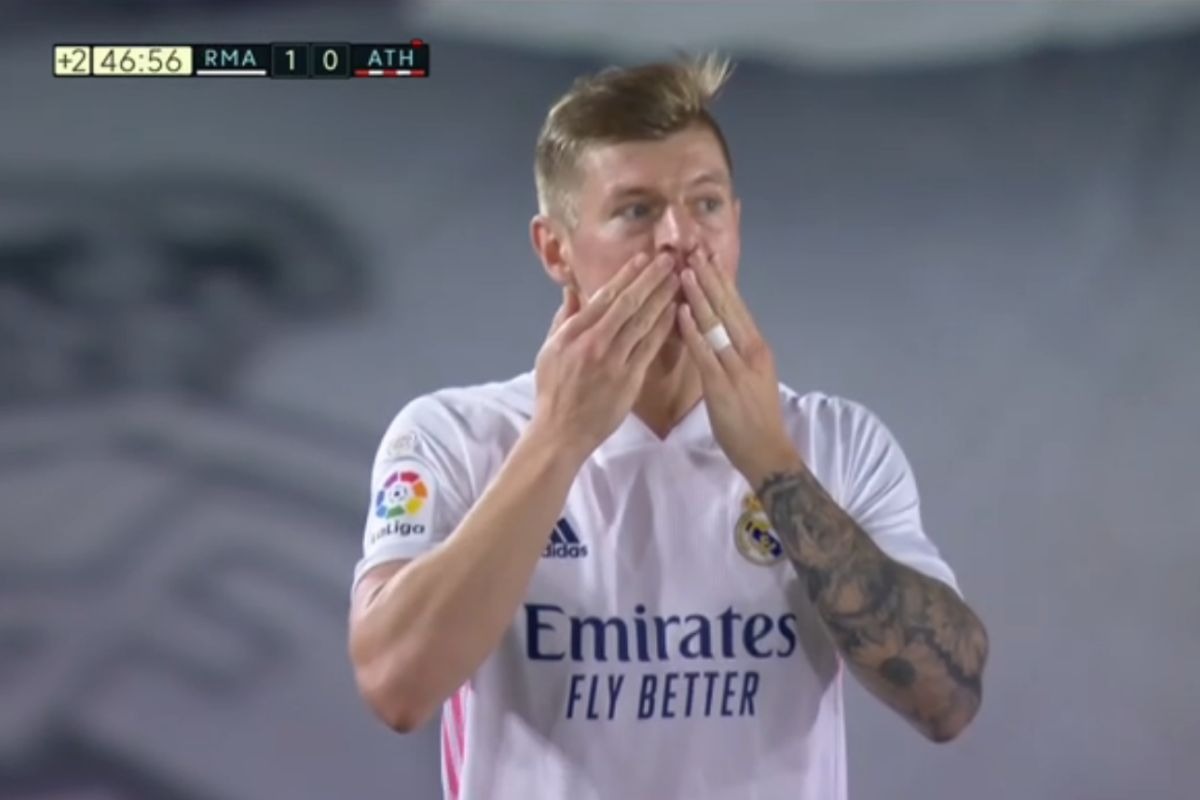 Ocurrió a poco de finalizar la primera parte. Vinicius Junior aguantó una pelota en área de Athletic Bilbao y soltó para Toni Kroos, que consiguió el primero de Real Madrid en condición de local.