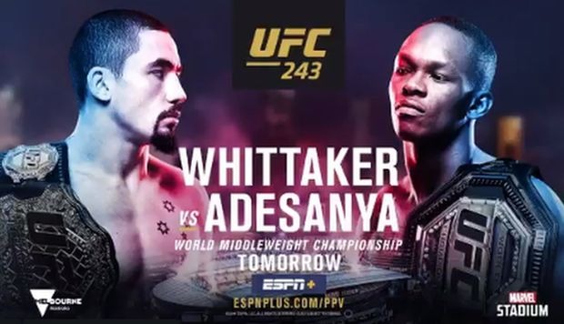 Whittaker (20-4), quien no ha tenido acción en más de un año, regresa al octágono en la contienda principal del UFC 243, con el complicado objetivo de quebrar el invicto de Adesanya (17-0).