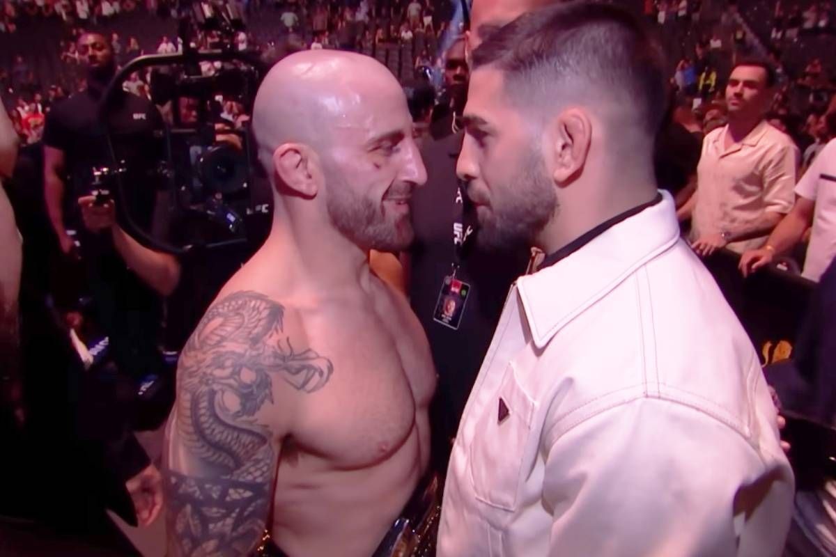CADA VEZ MÁS CERCA DE LA CORONA. Ilia Topuria tuvo un intenso careo con el campeón de peso pluma del UFC; Alexander Volkanovski, tras la victoria del australiano sobre el mexicano Yair Rodríguez en el UFC 290. El representante de España le plantó cara al monarca, en otra muestra más que quiere la pelea por el cinturón. Todo quedó registrado para la transmisión del evento a todo el planeta.