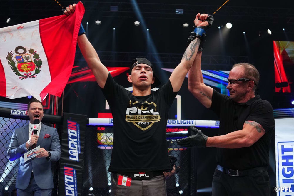 ARRASÓ A SU RIVAL. El peruano Jesús Pinedo le propinó una dura paliza al experimentado norteamericano Bubba Jenkins, derrotándolo por nocaut técnico en el segundo asalto y clasificó a la final del torneo de pesos pluma (66 kgs.) de la promoción Professional Fighters League (PFL), la noche del viernes 4 de agosto en el Boeing Center at Tech Port de la ciudad de San Antonio, Texas. Con esta gran victoria, Pinedo se medirá a Gabriel Braga, en una pelea de revancha en la gran final.