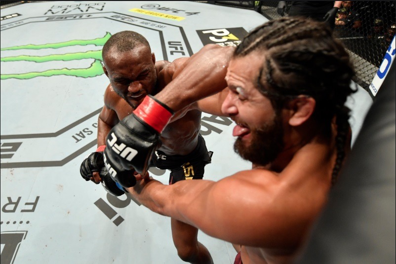 En el trámite de la pelea, el estilo de Usman de apelar a la presión cuerpo a cuerpo y evitar el intercambio, complicó el striking de Jorge Masvidal, que recibió poco castigo, pero estuvo todo el tiempo presionado contra la lona.