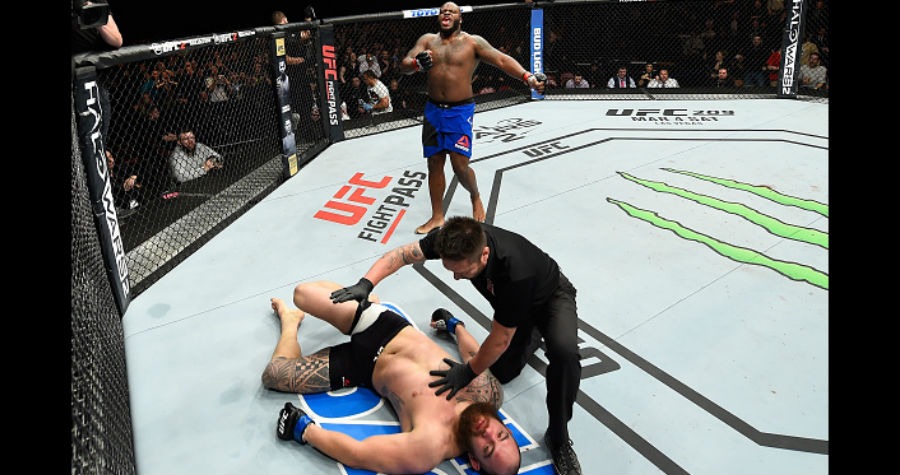 Travis Browne quedó aturdido por el castigo y unos segundos después se fue a la lona. Derrick Lewis de inmediato comenzó a 'bombardearlo' con su poderoso ground and pound.