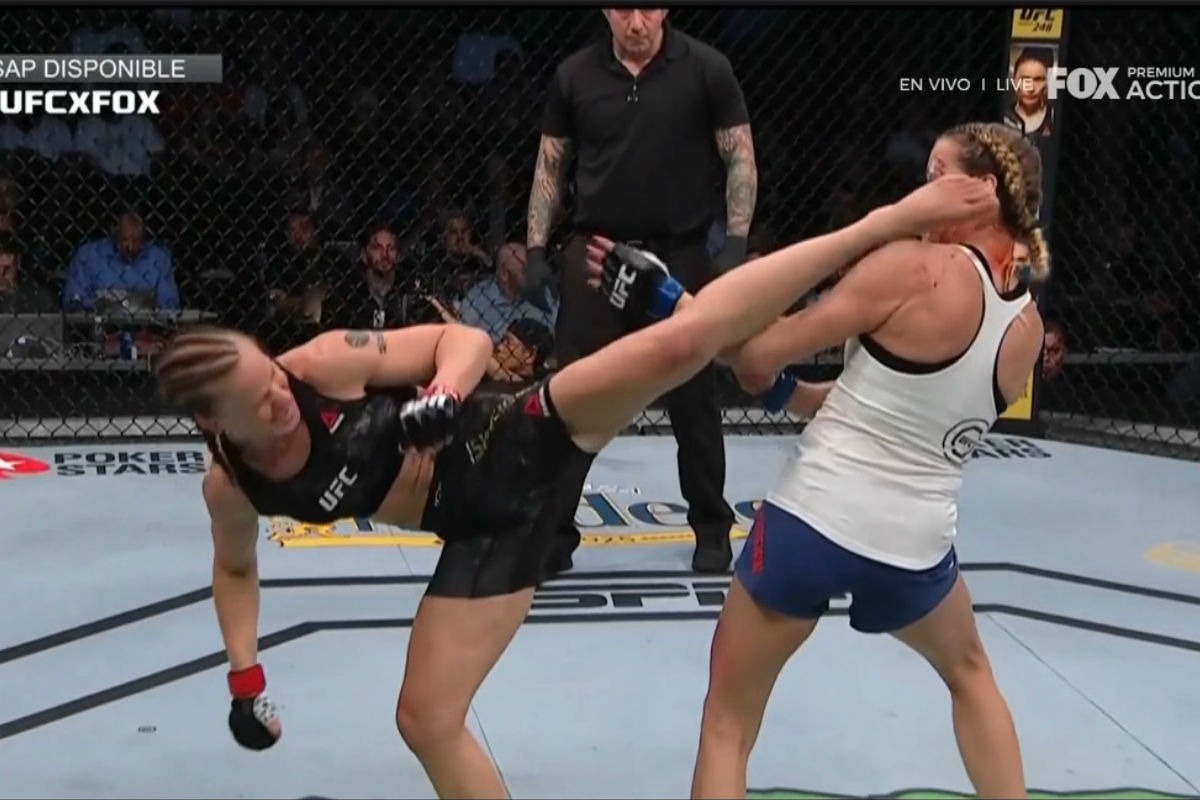 Valentina Shevchenko derrotó a Katlyn Chookagian por nocaut técnico, en el tercer round, tras atraparla con ‘un crucifijo’ y golpearla repetidas veces, para así retuvo su título mundial de peso mosca, en la pelea coestelar del evento UFC 247, en el Toyota Center de Houston, Texas. ‘La Bala’ Valentina no pasó apuros en el combate y dominó por completo a la espigada retadora norteamericana durante todo el combate, demostrando que es una peleadora de elite en esta conocida empresa de artes marciales mixtas.