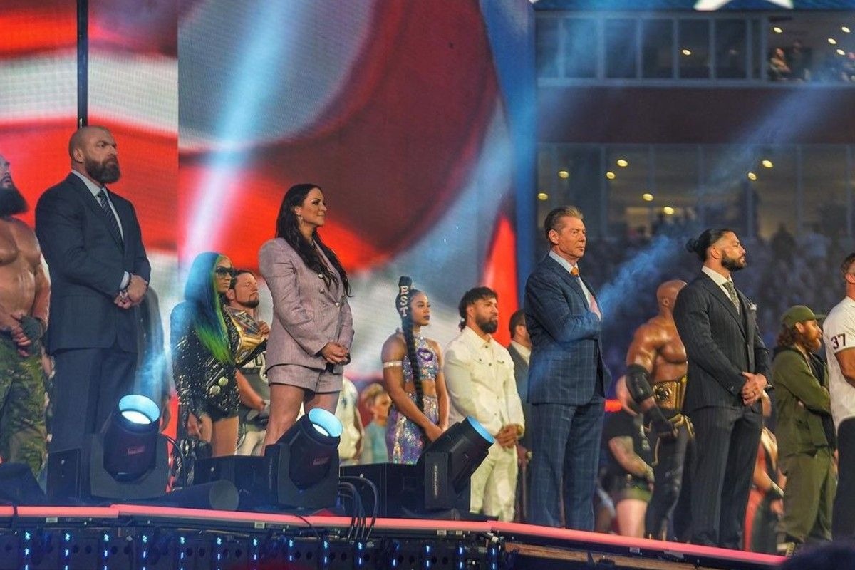 Liderados por el propietario de la compañía Vince McMahon, las superestrellas de WWE salieron al escenario, aplaudiendo fuertemente, junto con los aficionados de la compañía líder de la lucha profesional en el planeta.