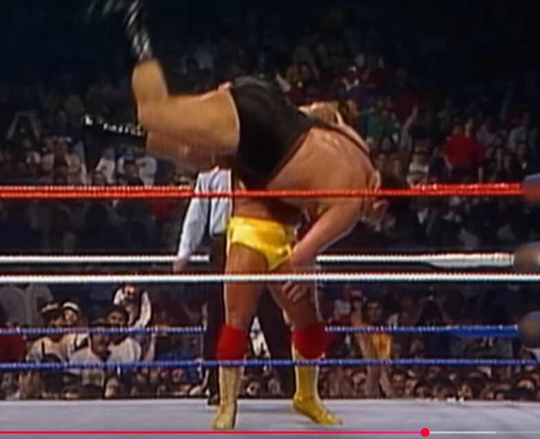El entonces campeón hizo historia al aplicar un “body slam” al retador que medía 2.24 m y pesaba 230 kg, es por eso de su apodo gigante, ya que literalmente nadie había logrado aplicarle ese movimiento.