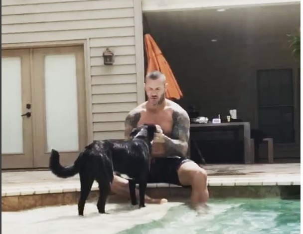En la escena se puede ver a Orton en la piscina con su perro, mientras unos niños juegan baloncesto dentro del agua.