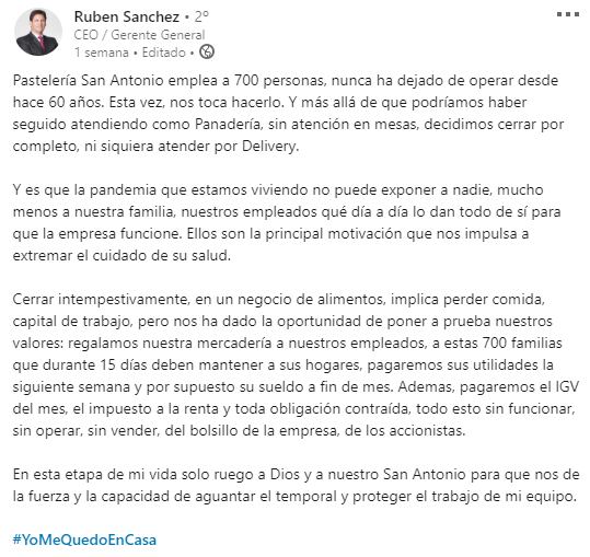 Este fue el post que se viralizó en redes tras darse a conocer la cuarentena en el país: “Cerrar intempestivamente en un negocio de alimentos implica perder comida, capital de trabajo, pero nos ha dado la oportunidad de poner a prueba nuestros valores: regalamos nuestra mercadería a nuestros empleados, a estas 700 familias que durante 15 días deben mantener sus hogares, pagaremos sus utilidades la siguiente semana y por supuesto su sueldo a fin de mes…”, dijo entre otras cosas Rubén Sánchez.