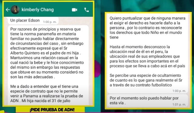 Sin embargo, Kimberly Chang ha dejado en claro que no puede hablar directamente sobre el caso pues las normas panameñas así se lo prohíben. Además, la chica reality contó que Alberto Quintero le ha confesado que no puede realizarse una prueba de ADN pues su contrato con los merengues no le permite viajar hasta Panamá.