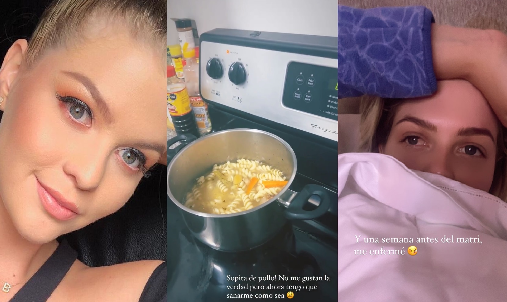 “Y una semana antes de mi matri, me enfermé... Sopita de pollo. No me gustan la verdad, pero ahora que tengo sanarme como sea”, escribió en sus historias de Instagram, donde también publicó un video donde explicó cómo se siente.