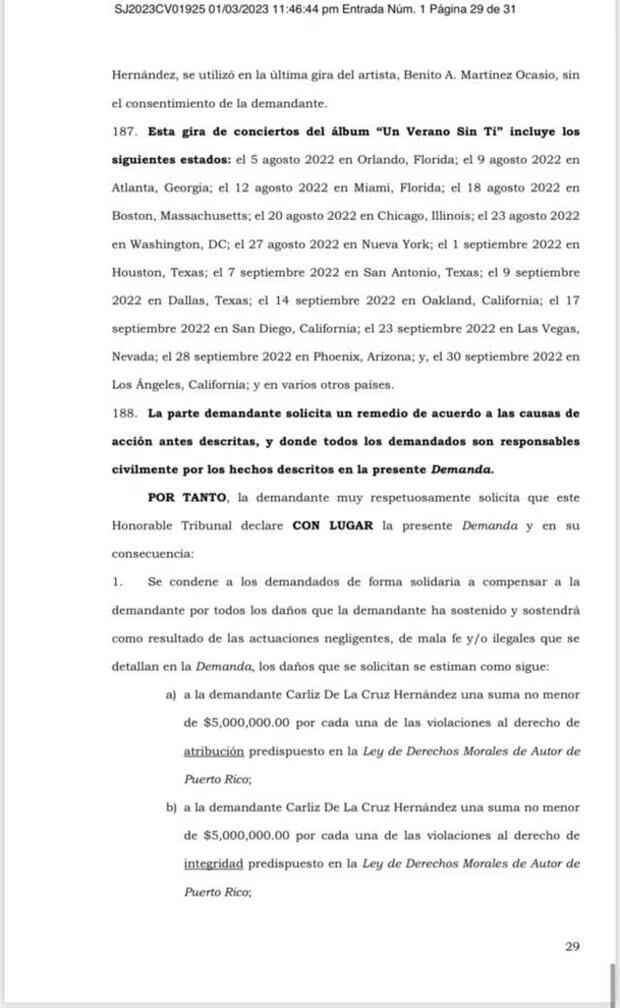 “Lo que la demandante considera ‘explotación comercial de su voz, de su identidad sin su consentimiento, en todas las facetas del negocio de la música alrededor del mundo. Durante ese tiempo, estos nunca hablaron sobre la utilización de la voz de la demandante en la canción ‘Pa ti’”, refiere la demanda.