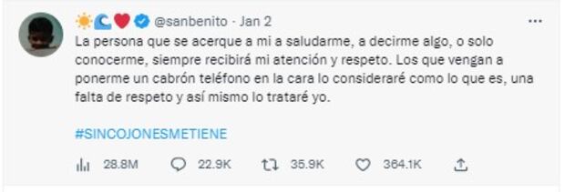 Eso sí, vale aclarar que tal publicación en Twitter no sería la primera defensa que señala el nacido en Puerto Rico ante la petición de los fans, pues en 2018, Benito se refirió a los seguidores que le pedían fotografías, e incluso, señaló que existen personas que ni siquiera lo saludan por querer tomarse una postal con él a toda costa.