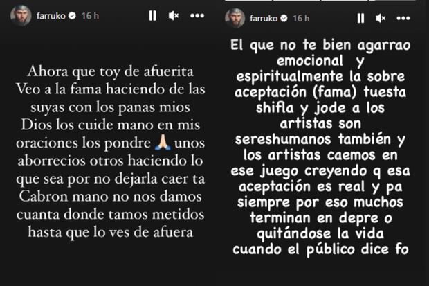 “Los artistas caemos en ese juego, creyendo que esa aceptación (de los fans) es real y para siempre. Por eso muchos terminan en depresión o quitándose la vida cuando el público dice ‘fo’”, añadió en otro historial.