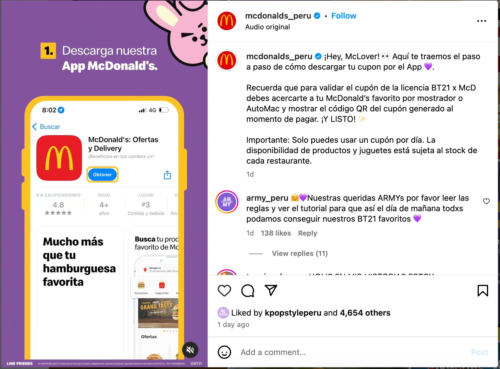 Los personajes de BT21 están disponibles en TODOS los locales de McDonald’s Perú a nivel nacional, hasta el 31 de agosto o agotar stock.