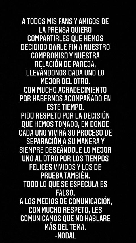 El intérprete de “Botella tras botella” aseguró que fue una decisión que tomaron en conjunto. “A todos mis fans y amigos de la prensa quiero compartirles que hemos decidido darle fin a nuestro compromiso y nuestra relación de pareja, llevándonos cada uno lo mejor del otro. Con mucho agradecimiento por habernos acompañado en este tiempo”, escribió en las primeras líneas de su mensaje.