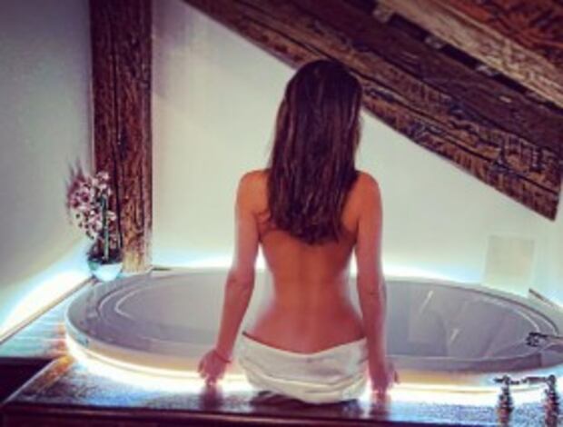 En tal sentido, la nacida en Medellín logró atraer todas las miradas al posar en topless junto al jacuzzi, en donde demuestra su diminuta cintura para después sumergirse en el agua.