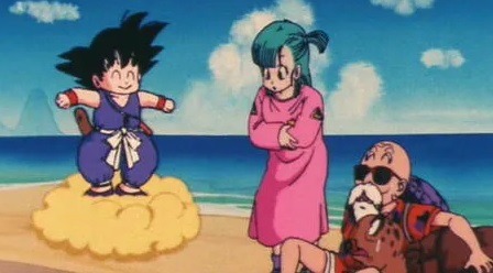 En uno de los primeros capítulos de Dragon Ball, el Maestro Roshi eleva su bastón e invoca a la nube voladora dejando sorprendidos a Bulma y Gokú. Gokú la recibe luego de haber ayudado a la vieja tortuga quien se encontraba atrapada en la arena.