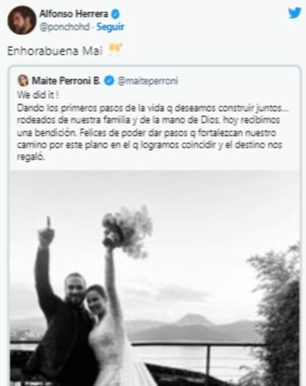 De hecho, fue Dulce María la primera en saludar a la nueva pareja. “Felicidades Maite y Andrés. Deseo que su matrimonio esté lleno de amor y bendiciones. Y que sigas cumpliendo tus sueños. Estoy con ustedes de corazón. Te ves hermosa”.