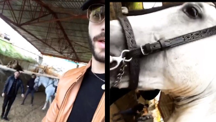 En la grabación se ve a Maluma junto a un caballo a quien bautizó como Hércules. El colombiano se sube al caballo y le pide al animal que pose para la cámara y este casi golpea la cámara del celular del cantante.
