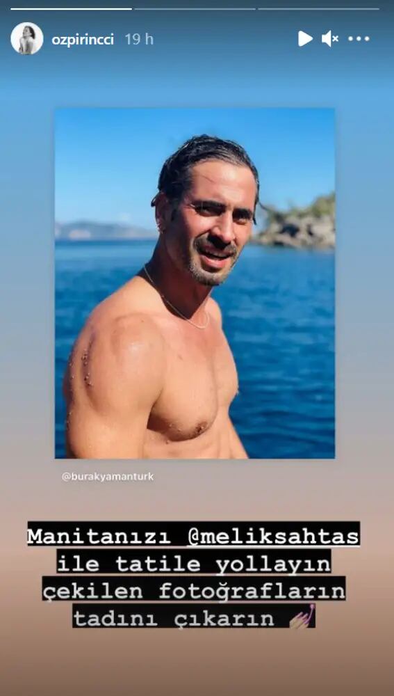 “Envía a tu novio de vacaciones con @meliksahtas y disfruta de las fotos”, escribe con gran sentido del humor Özge Özpirinçci. En la imagen podemos ver a su novio, Burak Yamanturk, disfrutando de un día en el mar. La foto fue hecha por el director turco Meliksah Altuntas.