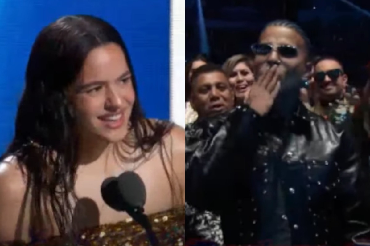 Antes de terminar su discurso de agradecimiento, Rosalía mencionó a su pareja Rauw Alejandro, quien le envió un beso volado desde su asiento.