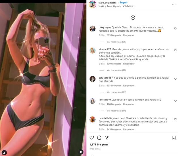 “Querida Clara... Si pasaste de amante a titular, recuerda que tu puesto de amante quedó vacante...”, “Menuda provocación y q bajo cae esta señora con poner esa canción”, “Y es que se atreve a poner la canción de Shakira que atrevida”, “Ahí se ve lo que es UNA PROVOCADORA e irrespetuosa y se nota que la sombra de Shakira la aterroriza que hasta tiene que hacer lo mismo que ella para estar con el otro, pero ante los ojos siempre será la mujer que daño un hogar y dejo a unos hijos sin familia”, fueron algunos de los comentarios que recibió la publicación en Instagram.