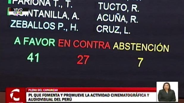 La Ley de Promoción de la Actividad Cinematográfica y Audiovisual, conocida como Ley de Cine, fue aprobada este miércoles por el Congreso de la República en primera votación.