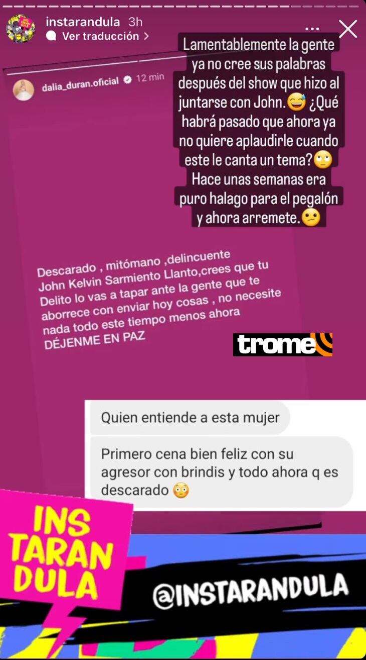 En otro momento, Dalia Durán escribió fuertes calificativos contra el padre de sus hijos, John Kelvin, pese a que semanas atrás fue captada abrazándolo y brindando con él a fin de superar la agresión física, psicológica y sexual que confesó en su momento.