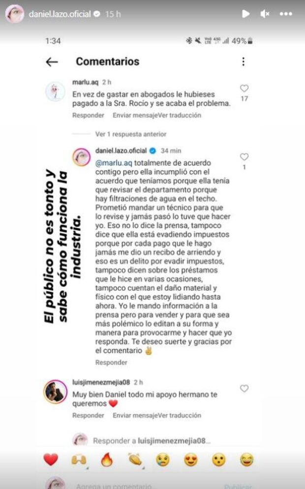 “Tampoco cuentan el daño material y físico con el que estoy lidiendo hasta ahora. Yo le mando información a la prensa pero para vender y para que sea más polémico, lo editan a su forma y manera para provocarme y hacer que yo responda”, concluyó Daniel Lazo.