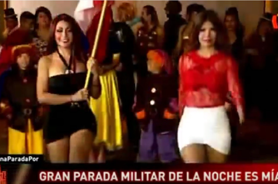 Deysi Araujo marchó al lado de Jenny Kume como la delantera del batallón. Todo estuvo bien hasta que Carlos Galdós hizo que la bailarina marchara en retroceso, ella intentó bailar y el vestido se le alzó.