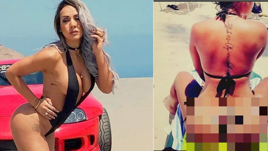 En la imagen se ve a Dorita Orbegoso en una playa de Aruba, ella le da la espalda a la cámara y muestra su ajustado bikini. La fotografía esta centrada en su espalda baja.