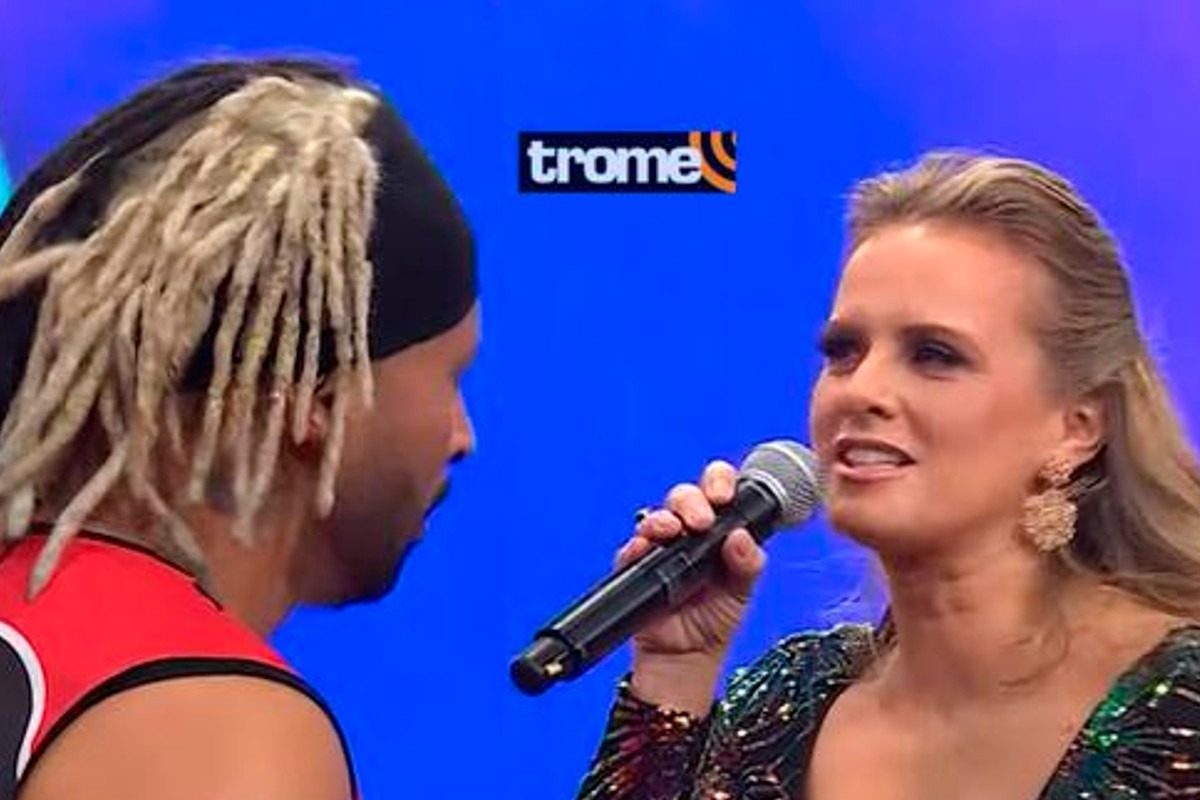 ¡SE FUE CON TODO! Durante la emisión de ‘Esto es Bacán’, Zumba le ‘robó un beso’ a Rossana Fernández Maldonado, una de las conductoras del programa, aunque se trató de un reto de actuación en las imágenes se puede ver que sí existe un ligero roce de labios.